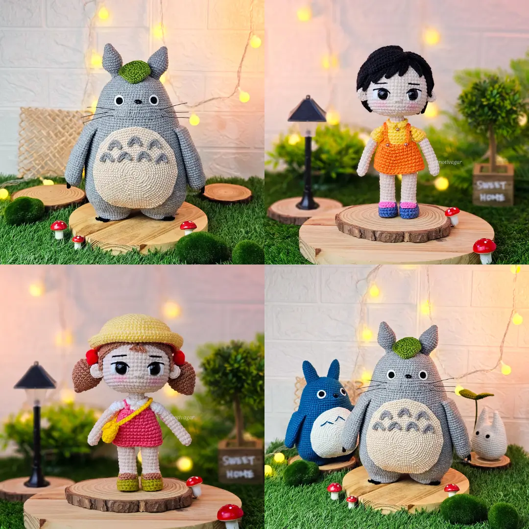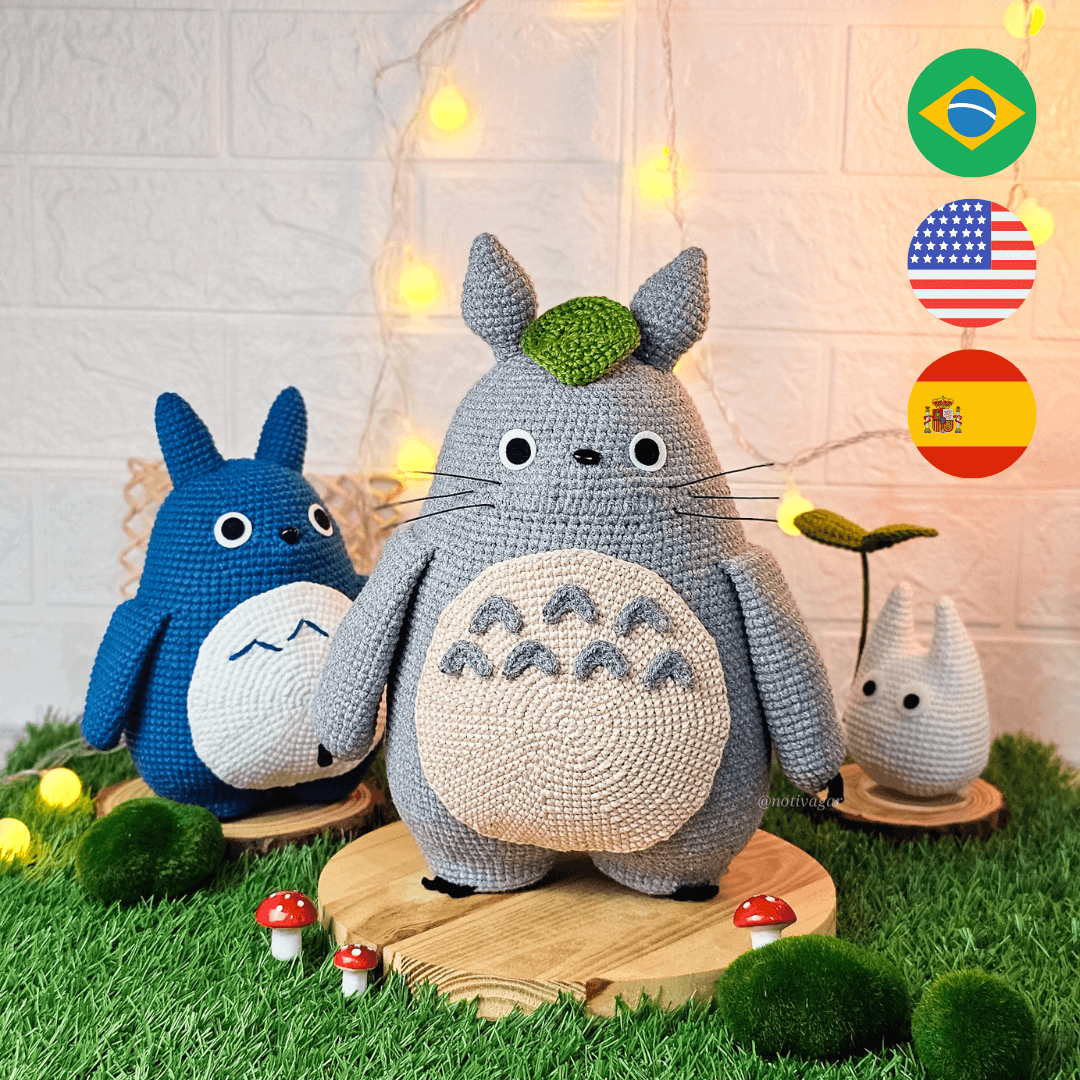 Este e-book contém a receita de amigurumis dos personagens: Totoros(cinza, azul e branco) e as irmãs Mei e Satsuki kusakabe (do filme Meu amigo Totoro)