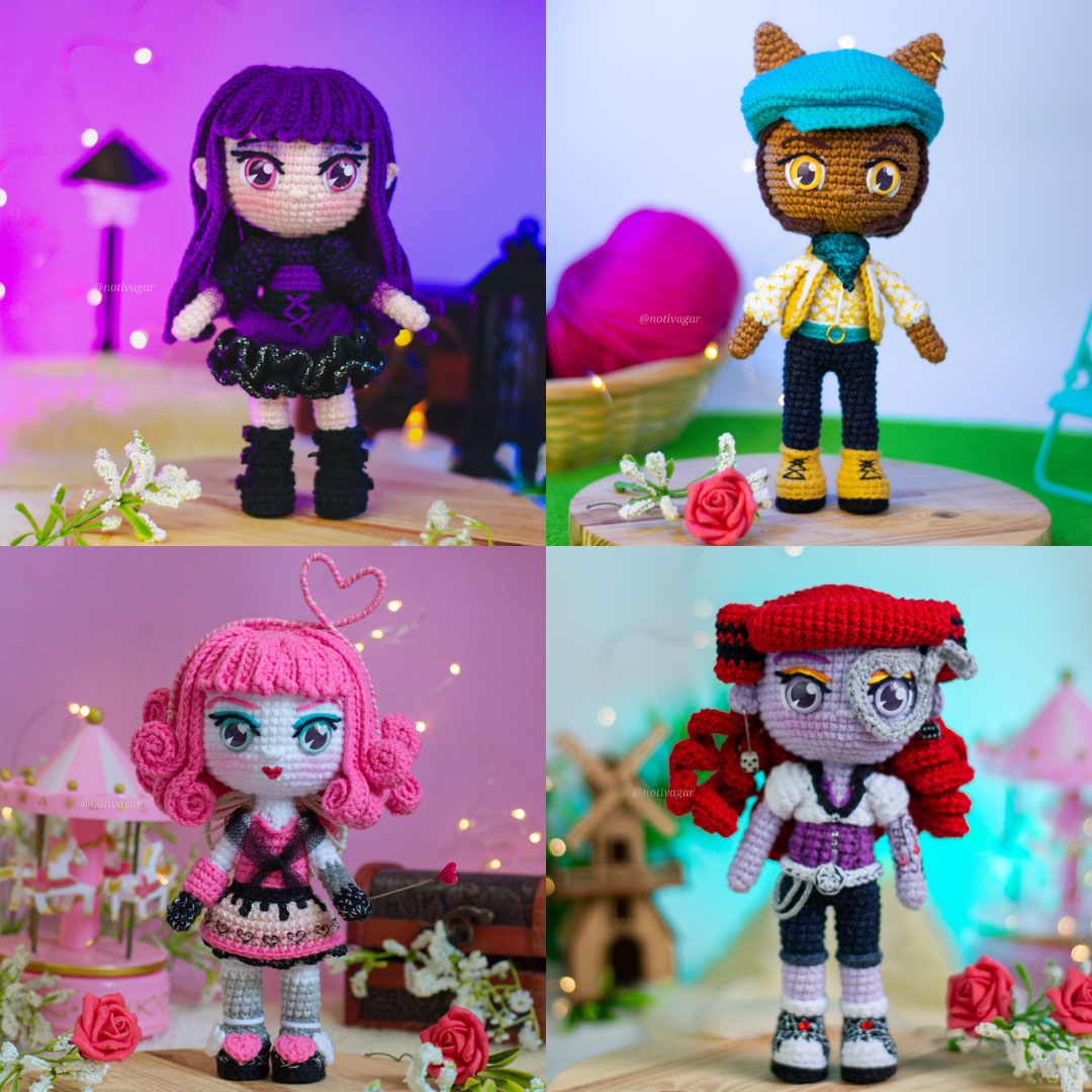 Este e-book contém a receita de amigurumis dos personagens: Elissabat, Cupido, Operetta, Clawd (Monster High).